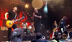 Bentley and later Gurewitz returned to Bad Religion in 1986, with the five-piece lineup releasing three albums in three years before Finestone left again in 1991.[2] He was replaced by Bobby Schayer, whose first album with the band was Generator in 1992.[2] After Bad Religion signed to Atlantic Records and released Stranger than Fiction in 1994, Gurewitz left the band again.[3] Shortly after the album's release, Brian Baker took Gurewitz's place in the group.[4] After three more albums, Schayer departed the band in 2001 due to a shoulder injury, and was replaced by Brooks Wackerman.[5] Around the same time, Gurewitz returned to the band for a third time.[6] Longtime guitarist Hetson left in 2013 and was replaced by Mike Dimkich,[7] and in 2016 Jamie Miller replaced Wackerman after he joined Avenged Sevenfold.[8]