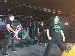 Keith Morris grew up in Hermosa Beach and attended Mira Costa High School, where brothers Greg and Raymond Ginn were also students.[36][37] After graduating in 1973 he studied fine art and painting while working at his father's bait shop.[36][38] One of his co-workers at the shop was Bill Stevenson, a Mira Costa student eight years Morris' junior who would also go on to be a member of Black Flag (Morris' father befriended Ozzie Cadena, who son Dez would also later join Black Flag).[39][40] Becoming a fan of heavy rock and proto-punk groups, Morris took a second job working at local record store Rubicon Records.[41] It was here that he struck up a friendship with Greg Ginn, whose sister was dating Morris' record store co-worker.[37] Morris soon left the family bait shop and began working for Ginn's amateur radio and electronics business, Solid State Tuners (SST).[42] The two bonded over shared musical tastes, including an interest in early punk rock groups, and decided to start a band together.[43] Morris originally planned to play drums in the group, but Ginn convinced him to take the role of vocalist after witnessing his frantic energy while singing along to the radio.[44] In the summer of 1976 they began rehearsing songs that Ginn had written on guitar, with Ginn's brother Raymond accompanying on bass guitar.[1] By early 1977 Morris had recruited friends of his to serve as the rhythm section, including bassist "Kansas" and drummer Brian Migdol, and the group took the name Panic.[3] Morris performed at Panic's early shows and on their debut EP, Nervous Breakdown, recorded in January 1978.[45] Later that year he and then-Panic bassist Gary McDaniel (later known as Chuck Dukowski) took up residence at "The Church", an abandoned Baptist church the band was then using as a rehearsal space.[46] The band changed its name to Black Flag in early 1979.[47]