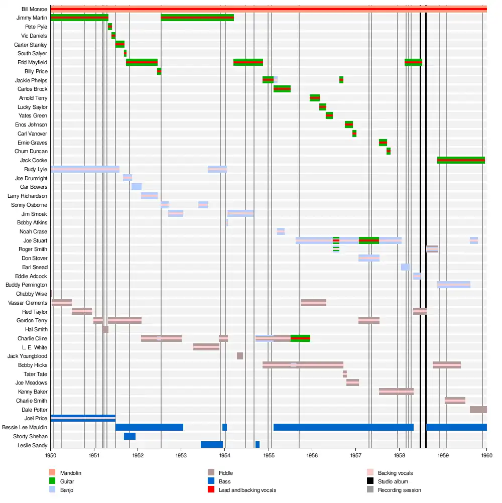 Brock left in early July, with Cline switching to guitar and Hicks covering banjo duties alongside fiddle.[92] The following month, Joe Stuart took over on banjo, joining on August 18, 1955, after playing mandolin with the group the night before.[93][94] In September, the band had its first recording session with Stuart and Mauldin, which spawned three tracks issued on albums in the 1960s.[95] Vassar Clements — who had performed alongside Hicks and fellow guest Gordon Terry at the September session — subsequently rejoined the band, which saw the third departure of Cline in December 1955 — replaced by Arnold Terry.[96] After touring the first two months of 1956, Terry left on March 2, replaced by Lucky Saylor.[97] He remained until the end of April, replaced by Yates Green in time for a tour which also included a brief spell with Rudy Lyle filling in on banjo for Stuart, who joined Hicks on fiddle.[98] By mid-June, Green had left the band. Stuart subsequently switched to guitar and Noah Crase returned on banjo for a week of rehearsals, before Roger Smith joined at the end of the month in a shared role with Stuart.[99] Phelps briefly returned on guitar during August.[100]