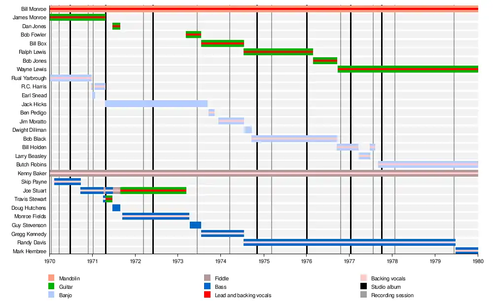 In February 1970, William "Skip" Payne took over as the BGB's bassist.[14] Just before his first session in late-March, however, his father suffered a heart attack and he returned home to be with him.[177] The four songs recorded at the session did not feature a bassist, with bass overdubbed later by an unknown musician.[173] Payne eventually left in mid-September, with Joe Stuart (who had recently started making appearances as second fiddler) replacing him in the lineup.[178] By the end of November, Rual Yarbrough had given Monroe his two-week notice of leaving, although he remained until a replacement could be found.[179] The group's final recording sessions of the year took place on December 2 and 3, with Bobby Thompson hired to play banjo and Kenny Baker joined on fiddle by guest Red Hayes and former BGB member Gordon Terry, who also played guitar.[180][181] Yarbrough had completed his departure by late-December, replaced starting on Christmas Day by Roby "R. C." Harris.[182]