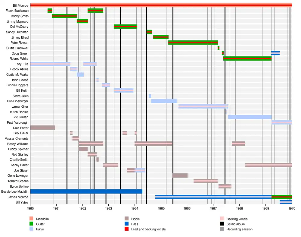 Ellis returned in September, when the band brought in Frank Buchanan to take over on guitar and vocals.[123] By November, he had been replaced by Bobby Smith.[124] Starting on November 30, 1960, the band recorded tracks for Monroe's third album, Mr. Blue Grass, with Carl Butler and Curtis McPeake performing session guitar and banjo, respectively.[123] Returning to touring at the beginning of 1961, the lineup of Monroe, Smith, Ellis and Mauldin was accompanied by various stand-in players on fiddle, including during the summer by former bassist Shorty Shehan and previous substitute Billy Baker.[125] After headlining the All Blue Grass Show on July 4, Ellis left the band. He was replaced by Bobby Atkins, returning after a brief spell a few years prior.[126] Billy Baker became a full member around the same time, although a month later he was replaced by the returning Vassar Clements.[126] Smith and Atkins were replaced by Jimmy Maynard and Curtis McPeake, respectively, ahead of sessions on November 9 and 10, 1961.[127]