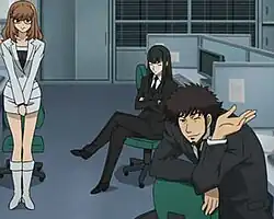 Takahiro Komori adapted Iwahara's work for animation, retaining the essence of the original designs and making the animators' work easier; Huang's hat and Yutaka Kouno's and Mayu Ootsuka's clothing were changed. Color designer Nobuko Mizuta was disappointed because much of the series is set at night and the main characters' clothing is generally dark-colored, but she gave the guest characters brightly-colored clothes. Komori said that when he draws female characters, he pays special attention to the line connecting her buttocks and legs.[4] For the OVAs, Iwahara was given the order to draw both characters Hei and Yin sexually appealing.[5] The animation studio wants the viewer focus on appealing action scenes involving Hei. However, there is a glimpse of the weakness of the character, and a tragic fate for Yin, giving the series a suitable culmination.