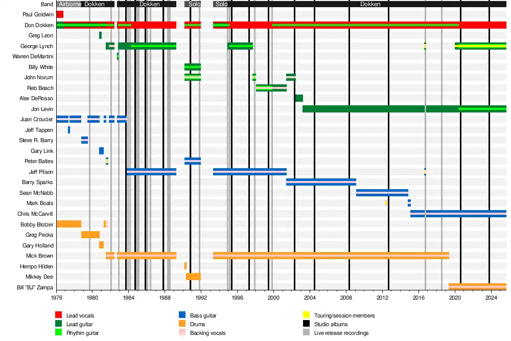 In late 1994, Lynch was convinced to reunite with Dokken to complete a reformation of the band's previous lineup, adding lead guitar overdubs to a new album released the next year, Dysfunctional.[17] However, after one more album, Shadowlife, Lynch left again in late 1997.[18] He was replaced by former Europe guitarist John Norum, who joined partway through an American tour before the end of the year.[19] By the next summer, former Winger and Alice Cooper guitarist Reb Beach had taken over the position.[20] Beach recorded one studio album, Erase the Slate, before Norum returned in July 2001.[21] The group started recording a new album, but in October 2001 it was announced that Pilson had been replaced for the sessions by bassist Barry Sparks, although this was initially not a full-time replacement.[22] The following month, however, Don Dokken confirmed that Pilson had officially left to focus on his various other projects.[23]