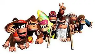 The Kong Family[2][3] (also known as the Kong Klan[4] and the DK Crew[5]) is a group led by Donkey Kong comprising his family and friends. They have numerous non-Kong allies who appear throughout the series, and are commonly antagonized by the Kremling Krew, who steal their valuables (and sometimes kidnap members of the Kong family) to further their nefarious goals.[6][7][8]