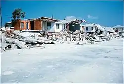 - September 23, 1975- Hurricane Eloise makes landfall near Destin with winds of about 125 mph (200 km/h), producing light precipitation across the peninsula with heavier amounts near the landfall location peaking at 14.9 inches (380 mm) at Eglin Air Force Base.[3] Hurricane-force winds and storm surge of up to 16 feet (4.9 m) across the panhandle destroy 500 small businesses and damage or destroy 8,000 houses. Damage in the state totals $100 million (1975 USD, $400 million 2008 USD).[4]