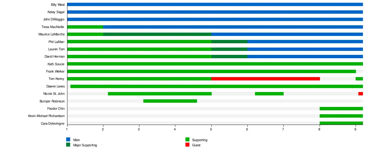 Guest stars have appeared on Futurama since its first season, in addition to the show's main cast of Billy West, Katey Sagal, John DiMaggio, Tress MacNeille, and Maurice LaMarche and supporting cast of Kath Soucie, Tom Kenny, Dawnn Lewis and former supporting cast member Frank Welker and Bumper Robinson. Nicole St. John started as recurring actors in the second season, but joined the guest stars starting with the ninth season. Phil LaMarr, Lauren Tom, and David Herman started as recurring actors in the first season, but joined the main cast starting with the sixth season. Feodor Chin, Kevin Michael Richardson, and Cara Delevingne joined the supporting cast in the eighth season.