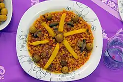 Adas polow: Rice with lentils, raisins, and dates.[18]