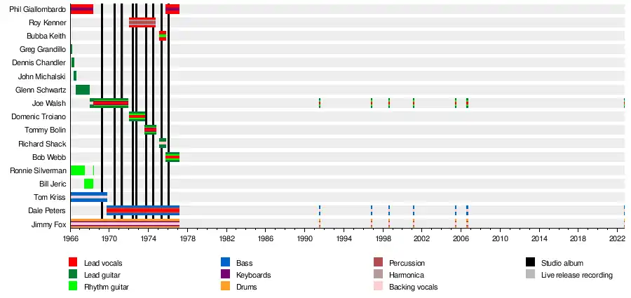 Since their original breakup, James Gang's classic lineup of Joe Walsh, Dale Peters and Jimmy Fox have temporarily reunited on several occasions. The first time was in July 1991, when they performed "Funk #49" during a Walsh solo show.[14] Next, the group played at an election rally for Bill Clinton in November 1996,[7] followed by a performance on The Drew Carey Show in 1998.[15] In February 2001, the trio (joined by keyboardist Mark Avsec) played three shows at the Rock and Roll Hall of Fame and Allen Theatre in Cleveland.[16] During August and September 2006, the band performed its longest reunion tour to date in the US.[17] For the shows, the core trio were joined by keyboardist Bill Appleberry, plus backing vocalists Gia Ciambotti, Robbyn Kirmsse and Stacy Michelle.[18] The band performed at the Taylor Hawkins Tribute Concerts at Wembley Stadium and the Kia Forum in September 2022.[19] On November 13, 2022, supported by Mark Avsec and a vocal trio, and joined on their encore by Dave Grohl on drums, the group performed at the VetsAid concert in Columbus, Ohio. While this was billed as "One Last Ride" for the James Gang,[20] Joe Walsh later raised the possibility of more James Gang performances.[21]