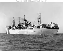Belle Isle was built by New England Shipbuilding Corporation. Her keel was laid on 19 September 1944. She was launched on 3 November.[10] Completed by Bethlehem Steel Co., Hoboken, New Jersey,[26] she was delivered on 15 November.[10] Built as a repair and supply ship, she was placed in reserve at San Diego, California in August 1946. Reclassified as a general stores issue ship in August 1951, she was struck from the navy list in April 1960. Presumed scrapped in the United States.[26]
