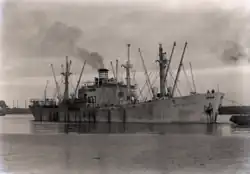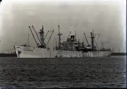 Niels Poulson was built by J. A. Jones Construction Company, Brunswick. Her keel was laod on 18 August 1944. She was launched on 18 August and delivered on 5 September.[55] Built for the WSA, she was operated under the management of Dichmann, Wright & Pugh.[6] She struck a mine off Gorgona, Italy on 14 September 1946 whilst on a voyage from Baltimore to Livorno. She was towed in to Livorno and beached. Declared a constructive total loss, she was scrapped at Genoa in November 1948.[56]