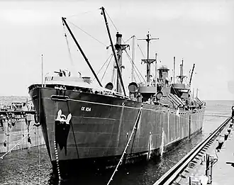 Palawan was built by Bethlehem Fairfield Shipyard, Baltimore, Maryland. Her keel was laid on 10 July 1944. She was launched on 12 August and delivered on 29 August.[4] To the United States Navy. Laid up in reserve at San Diego, California in January 1947. To the United States Maritime Administration in February 1962 and laid up in Suisun Bay.[5] She was scuttled off Redondo Beach, California on 13 September 1977.[6]