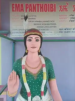 Panthoibi (ꯄꯥꯟꯊꯣꯏꯕꯤ) was a Meitei princess from the Ningthouja dynasty. She was first married to Prince Tarang Khoinucha, the son of King Khaba Sokchrongba of the Khaba dynasty. Later, she married Nongpok Ningthou, the chief of the Selloi Langmai hills, also called the Nongmaiching hills. Panthoibi and Nongpok Ningthou were later worshipped as deities by the Meitei people, which led to the beginning of the Lai Haraoba festival.[6][7][8]