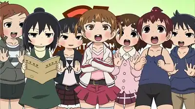 Some of the characters from the anime adaptation of Mitsudomoe. From left to right: Miyashita, Hitoha, Miku, Mitsuba, Yuki, Futaba, and Shinya.