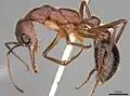 Roger[33] | 1861 | Specimens of this species are only known from workers collected in Queensland. The workers are large, measuring 21 to 22 millimetres (0.83 to 0.87 in). The head, node, thorax and postpetiole are red, the mandibles are yellow, and the antennae, clypeus and legs are reddish yellow. The gaster is black.[34] |