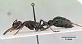 Fabricius[29] | 1804 | Colonies are restricted to Tasmania, with all castes known. The workers measure 14 to 18 millimetres (0.55 to 0.71 in), the queens are 22 to 24 millimetres (0.87 to 0.94 in) and males are 16 millimetres (0.63 in). Most of the body is black, and the antennae, parts of the gaster, labrum legs, mandibles and postpetiole are ferruginous. Queens are ergatoids.[30] |