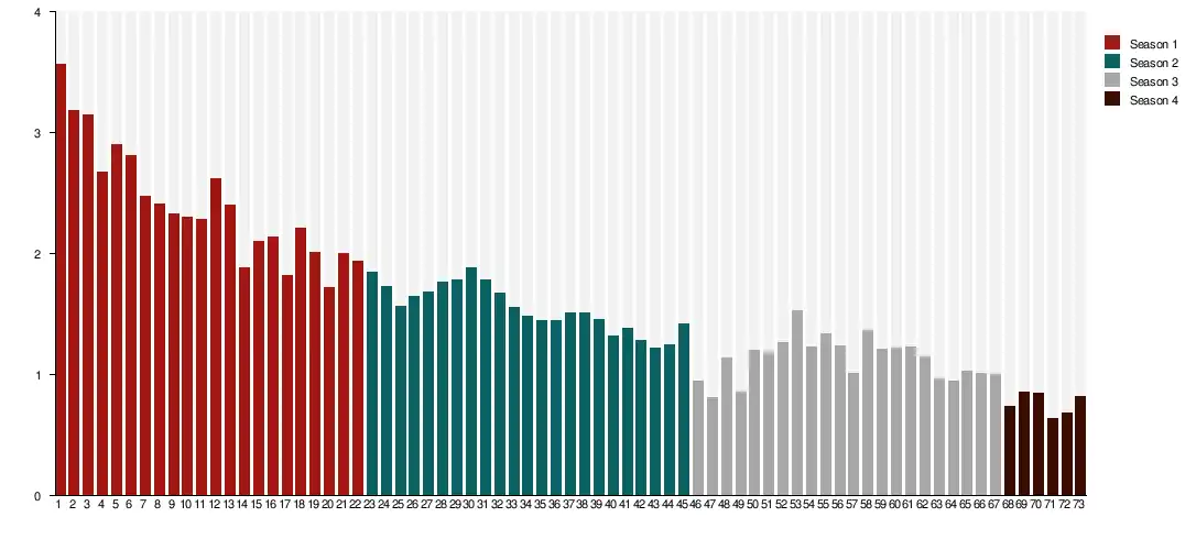 | 1 | 3.57 | 3.19 | 3.15 | 2.68 | 2.90 | 2.81 | 2.48 | 2.41 | 2.33 | 2.30 | 2.29 | 2.62 | 2.40 | 1.89 | 2.10 | 2.14 | 1.82 | 2.21 | 2.01 | 1.72 | 2.00 | 1.94 | – | |