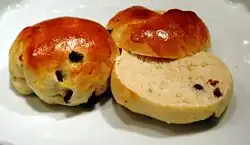 - Bolle – a small wheat bun pastry with usually a round top and flat bottom that contains wheat flour, sugar, yeast, eggs, milk, water and often also cardamom and hornsalt. Buns can be served whole or split in half with butter and toppings as a dessert, a snack or often as an accompaniment to coffee. They often contain raisins (rosinbolle) or chocolate (sjokoladebolle).[3]