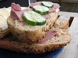 - Smørbrød – a traditional open-faced sandwich that usually consists of a piece of buttered bread topped with commercial or homemade cold cuts, pieces of meat or fish, cheese or spreads, and garnishes.[25]