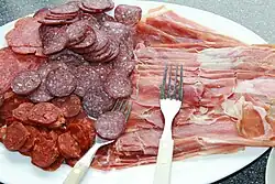 - Summer sausage – a number of sausages that have been preserved through salting (curing) or smoking and drying. Cured sausages are made from chopped or ground, cleanly cut meat and fat to which various flavors are added, through the addition of spices, herbs, alcohol and the like. In some types, blood and offal are also used as ingredients.[76]