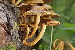 - ^ Smith AH, Brodie HJ (1935). "Cultural characters and pairing reactions of monosporous mycelia and development of the fruit body of Pholiota (Flammula) polychroa". Botanical Gazette. 96 (3): 533–546. doi:10.1086/334499. S2CID 83863682.