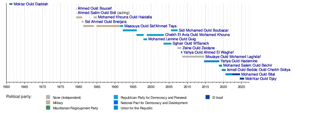 This is a list of prime ministers of Mauritania since the formation of the post of Prime Minister of Mauritania in 1960 to the present day.