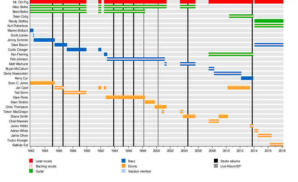 After Chinn, founding guitarists Marc and Brent Belke served the longest tenures, at 22 and 15 years respectively (not counting the band's inactive time). Bassist Rob Johnson played with the group for nine years, while Fleming and bassist Dave Bacon each spread two stints in the group over nearly eight years. The longest-standing consistent lineup lasted from late 1992 to early 1998 and featured Chinn, both Belkes, Johnson, and drummer Dave Rees.