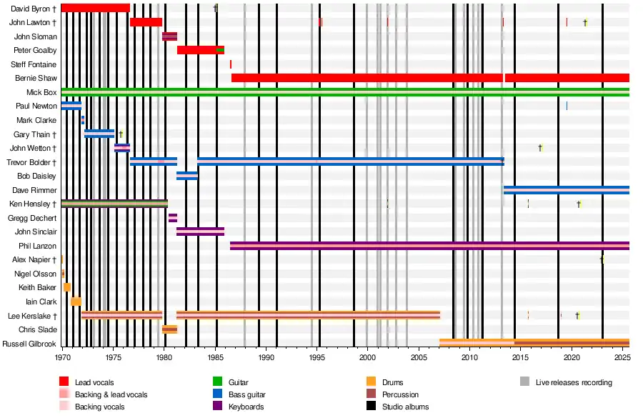 | Ken Hensley | 1969–1980 (plus live guest in 2001 and 2015[18]) (died 2020)[19] |