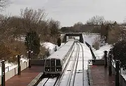 The Washington Metro system was conceived as an alternative to constructing a large freeway system throughout the Washington, D.C. area. It was partially financed with funds originally dedicated to highway construction.[4] Construction began in 1969, and in 1976 the first section of the Metro system opened along the Red Line between the Farragut North and Rhode Island Avenue stations in Washington, D.C. Throughout the 1970s and 1980s, more stations were opened in the city and the suburban communities of Arlington County, the City of Alexandria, and Fairfax County in Virginia as well as Montgomery and Prince George's Counties in Maryland. By 1991, five rail lines were open: the Red, Orange, Yellow, Green, and Blue Lines. The system, as originally planned, was completed in 2001 with the extension of the Green Line to Branch Avenue. In 2004, three stations were opened: an extension of the Blue Line to the Morgan Boulevard and Downtown Largo stations and the first infill station, NoMa–Gallaudet U.[5] The Silver Line opened in two phases, adding five stations in 2014 and six in 2022.[6][7] On the Yellow and Blue Lines, an additional infill station at Potomac Yard opened on May 19, 2023.[8]