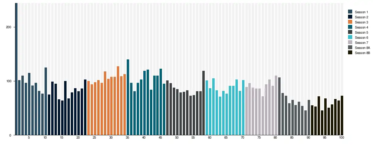 During the course of the series, 100 episodes of Wentworth aired over eight seasons, between 1 May 2013 and 26 October 2021.