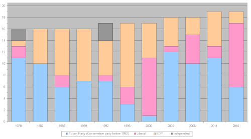 The chart on the right shows the information graphically, with the most recent elections on the right (going as far back as the introduction of political parties in 1978). The Yukon Party (which was named the Yukon Progressive Conservative Party prior to 1992) has been the most successful since political parties were officially recognised, having won six out of ten elections. The NDP have won three elections, and the Liberal party have won two elections.