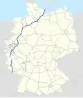 | Vogelfluglinie, Hansalinie, Ruhrtangente, Kölner Ring, Eifelautobahn | Heiligenhafen – Lübeck – Hamburg – Bremen – Osnabrück – Münster – Hamm – Dortmund – Hagen – Wuppertal – Remscheid – Leverkusen – Cologne – Blankenheim