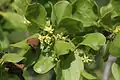 | Opiliaceae (bally-coma family) | Opilia (derivation unknown)[136][137] | 11 genera, in the tropics and temperate Oceania[136][138] | Parasitic evergreen shrubs and trees, and a few woody vines[42][136] | Santalales[136] | ![]() Opilia amentacea |