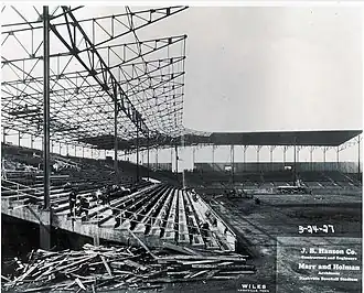 Sulphur Spring Park, as Sulphur Dell was first known, was located in a bottomland, or dell, which was used by early settlers for trading and watering at a natural sulphur spring.[1] In the 1850s, a portion of the land was re-purposed for baseball.[2] By 1870, the baseball grounds were referred to as "Athletic Park".[3] In 1885, a wooden grandstand was built at the corner of modern-day Fourth Avenue North and Jackson Street to accommodate fans of the Nashville Americans, who were charter members of the original Southern League.[2][4] Several other minor league teams followed the Americans, but the ballpark's longest tenant was the Southern Association's Nashville Vols, who played there from 1901 to 1963. Sportswriter Grantland Rice started referring to the ballpark as "Sulphur Spring Dell" in 1908, which he later shortened to "Sulphur Dell".[5]