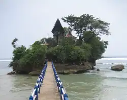 Some beaches are considered sacred and ritual processions are held on these. Sea temples are erected on the coasts of Bali, Lombok, and Java to appease the god or goddess of the Sea.[7][8] Some beaches on the southern coast of Java are considered sacred because of their association with the figure of Nyai Roro Kidul, Queen of the Southern Sea. In accordance with Javanese beliefs, people are warned not to wear green clothes on these beaches because the color is sacred to her and wearing it may offend her and cause the person to drown into the sea.[8][9][10] Rituals are enacted on beaches such as Parangtritis, Pangandaran, Karang Bolong Beach, Ngliyep, Puger, and Banyuwangi.[8][10]