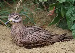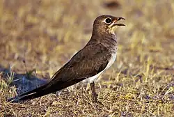 Bustards are large terrestrial birds mainly associated with dry open country and steppes in the Old World. They are omnivorous and nest on the ground. They walk steadily on strong legs and big toes, pecking for food as they go. They have long broad wings with "fingered" wingtips and striking patterns in flight. Many have interesting mating displays.