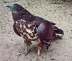 Bustards are large terrestrial birds mainly associated with dry open country and steppes in the Old World. They are omnivorous and nest on the ground. They walk steadily on strong legs and big toes, pecking for food as they go. They have long broad wings with "fingered" wingtips and striking patterns in flight. Many have interesting mating displays.
