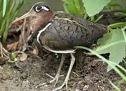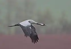 Bustards are large terrestrial birds mainly associated with dry open country and steppes in the Old World. They are omnivorous and nest on the ground. They walk steadily on strong legs and big toes, pecking for food as they go. They have long broad wings with "fingered" wingtips and striking patterns in flight. Many have interesting mating displays.