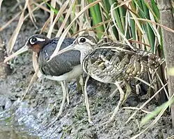 Bustards are large terrestrial birds mainly associated with dry open country and steppes in the Old World. They are omnivorous and nest on the ground. They walk steadily on strong legs and big toes, pecking for food as they go. They have long broad wings with "fingered" wingtips and striking patterns in flight. Many have interesting mating displays.