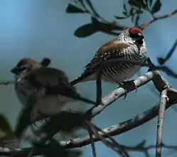 The estrildid finches are small passerine birds of the Old World tropics and Australasia. They are gregarious and often colonial seed eaters with short thick but pointed bills. They are all similar in structure and habits, but have wide variation in plumage colours and patterns.