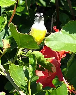 The bananaquit is a small passerine bird. It has a slender, curved bill, adapted to taking nectar from flowers. It is the only member of the genus Coereba (Vieillot, 1809) and is normally placed within the family Thraupidae.