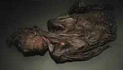 The man was found with his skull crushed and his leg broken. A rope was also found around his neck, indicating death by hanging or strangulation.[7][8] Examination of bog bodies such as Cashel Man have led scientists to speculate that wounds such as broken bones may have occurred after death due to the weight of the peat.[9] The body is in storage at the National Museum of Copenhagen.[7] |