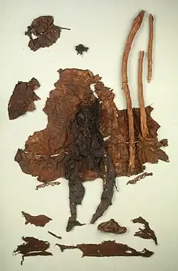 Hair, skin, nails, and his few clothes were also preserved.[53] He was found with a leather belt, shoes, and a pair of breeches.[54] |
