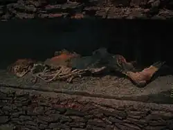 The body was discovered lying on its right side. Like the Windeby bodies, Dätgen man, and other bog bodies, some sticks were on top of him, probably to hold his body down. A piece of wool fabric and an animal skin cape were found on top of his body. He is currently on display at the Landesmuseum Natur und Mensch with the Husbäke man in Oldenburg, Germany.[61] |