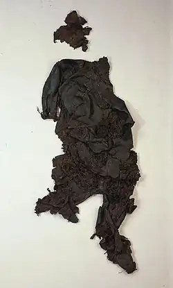 The corpse was discovered 100 cm below the surface of the bog on 17 May 1890 by peat workers. Along with a woolen textile (pictured), many birch branches were found over the body. After the body had been moved to storage, it had decomposed severely. It is unknown what the cause of death was, although it is thought by some that the type of textile was used as a garrote or for strangulation.[50] |