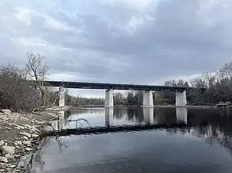 | Morris Island Train Bridge | Pedestrian pathway | 498 m | 1915 | 45°27′59.26″N 76°17′10.57″W / 45.4664611°N 76.2862694°W | Originally carried Canadian Northern Railway (1915—1998) and the Ottawa Central Railway (1998—2008). Converted into a pedestrian bridge in 2014. Fitted to accommodate snowmobiles in 2022.[1] | |