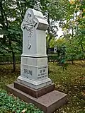 Over time the cemetery became a popular and prestigious burial ground for those of many areas of society. The wealthy merchant A.I. Kosikovsky was buried under a monumental sarcophagus on a high pedestal surmounted by a canopy on eight fluted columns.[4] Opposite it stood a similarly grand monument to the statesman Pavel Demidov, which has since been lost.[4] In 1857 the remains of the composer Mikhail Glinka were returned from Berlin and buried in the cemetery, with a grand monument erected two years later to the design of architect I. I. Gornostayev, with sculptures by Nikolay Laveretsky.[4][9] On 1 February 1881 the author Fyodor Dostoevsky was buried in the cemetery, with a similarly large monument.[4][10] During the 1880s composers Modest Mussorgsky and Alexander Borodin were buried in the northern part of the grounds, with Pyotr Ilyich Tchaikovsky following in 1891.[4][11][12][13]