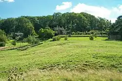 | Alexander de Bykemore was granted a licence to crenellate the castle in 1310.[51] The manor included a courtyard, internal buildings, a gatehouse and a curtain wall.[51] It is possible that the original 13th-century structure may have more closely resembled a Norman castle than a manor house. It was positioned on a spur above two valleys, surrounded by additional earthworks probably built as part of the same manor project.[51] | ||||