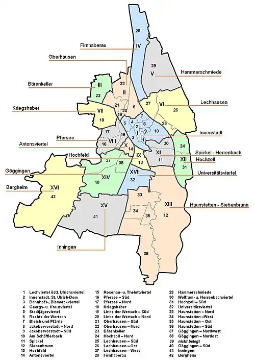 | 1 Lechviertel, östl. Ulrichsviertel | 4,115 | 13 Hochfeld | 8,688 | |