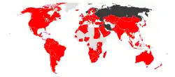 In 2024, there are at least 29,000 KFC outlets in 147 countries and territories in the world where 10,000 of those stores are in China alone.[1] The first KFC franchise opened in the United States in 1952.[2] The first overseas franchise was established in the United Kingdom in May 1965. A large number of Caribbean and developed Western markets entered by the early 1970s. This was followed by expansion throughout the Middle East and developed Asian markets from the mid-1970s and into the 1980s. China was entered in 1987. Expansions were made into most of Europe and South America in the early 1990s. The most recent area of expansion is Africa, where the company is targeting the continent's growing middle class.