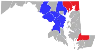 County executives head nine of the 23 counties of Maryland: Anne Arundel, Baltimore, Cecil, Frederick, Harford, Howard, Montgomery, Prince George's, and Wicomico. All of these counties have chartered governments and county councils; while Dorchester and Talbot counties also have chartered governments, they do not have executives. The other 12 counties are governed by boards of county commissioners.[1] As of 2025, the Democratic Party held six county executiveships, while the Republican Party held three.